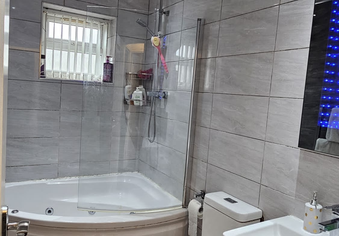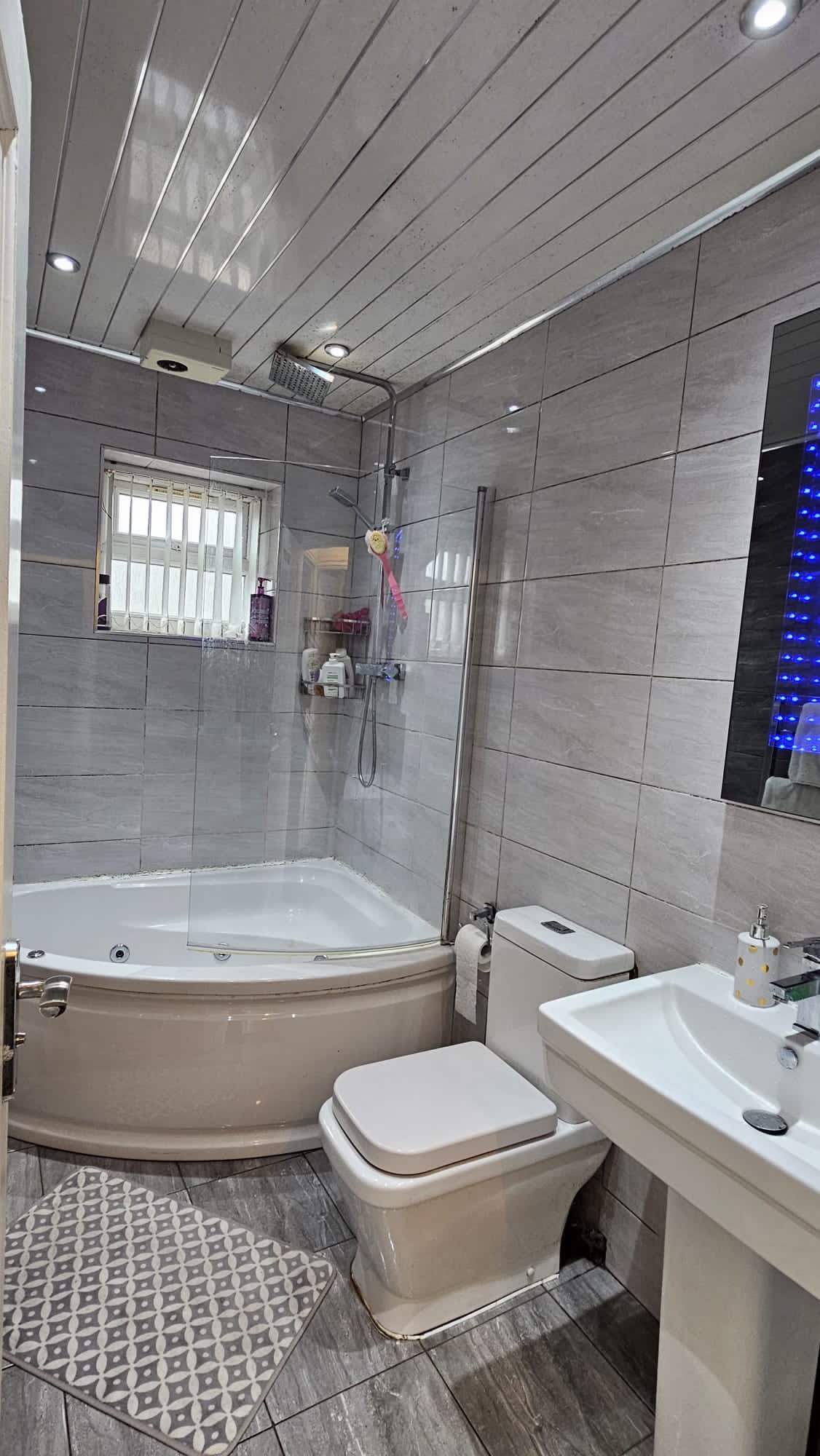 Ground Floor Bathroom: Double Glazed Window overlooking Rear. Having tiled walls and floors. Corner panelled Bath with mixer taps and 6 jet Jacuzzi. Mixer Shower Unit. Shower Screen. W.C. Pedestal Wash Basin. Central Heating Radiator. Vent Fan. UPVC Cladding. Vanity Mirror.