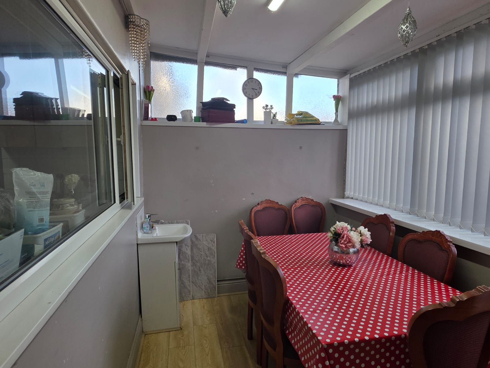 Conservatory: Size 2.05m x 3.35m (6’72” x 10’99”). Having Power Point. Double Glazed Window overlooking Rear. Having Store Room. Laminated Floor. Gives access to Rear Garden.