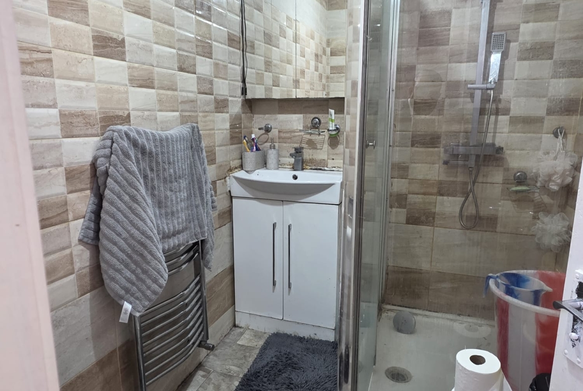 Shower Room: Having W.C. Inset Wash basin. Shower Cubicle. Tiled Walls. Shower Screen. Central Heating Radiator. Vent Fan.